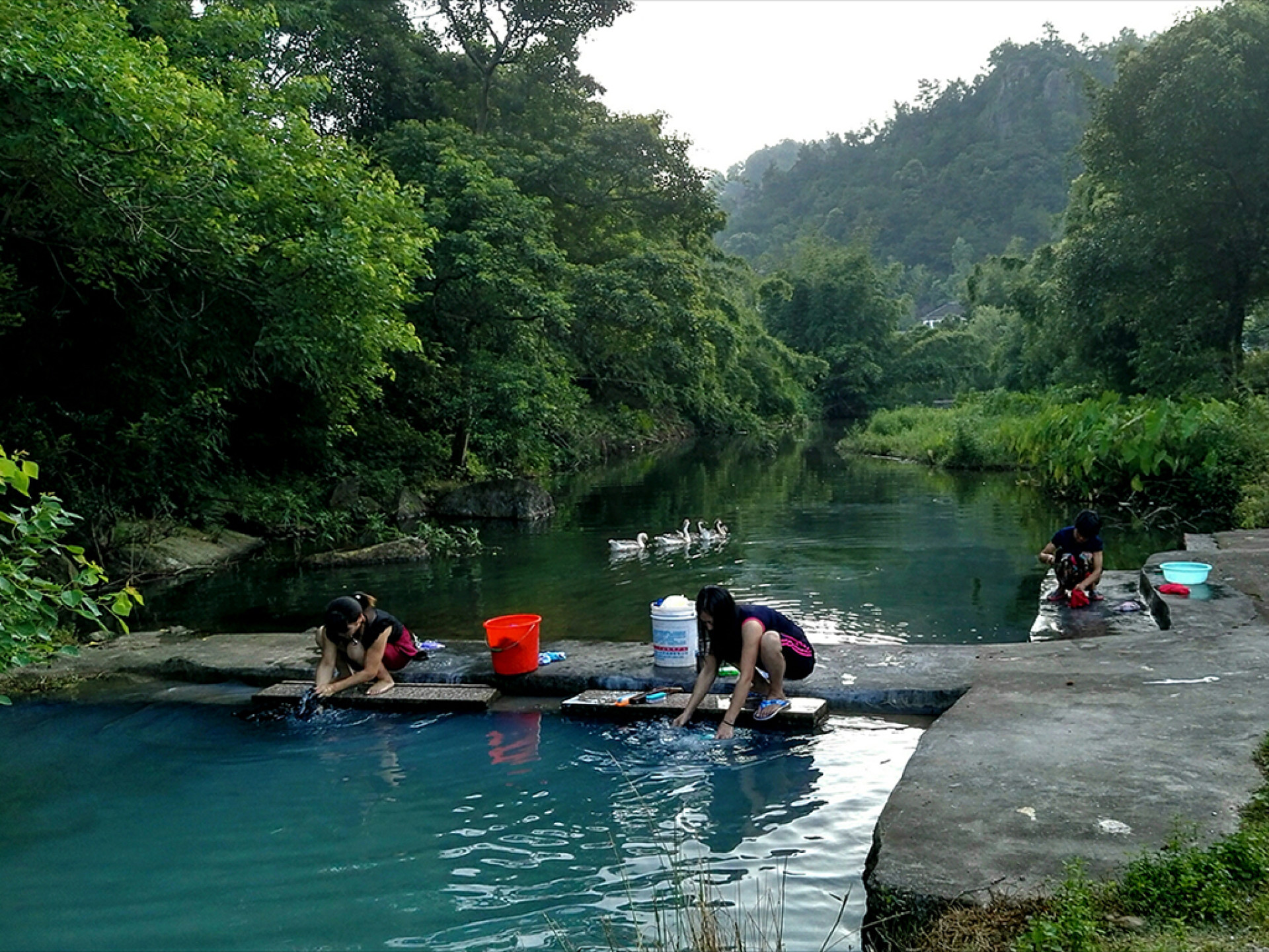 此图拍摄于2016年7月15日苍南县望里镇护法寺,昔日溪水又脏又臭,环境治理后,如今成为村民洗衣的好去处。