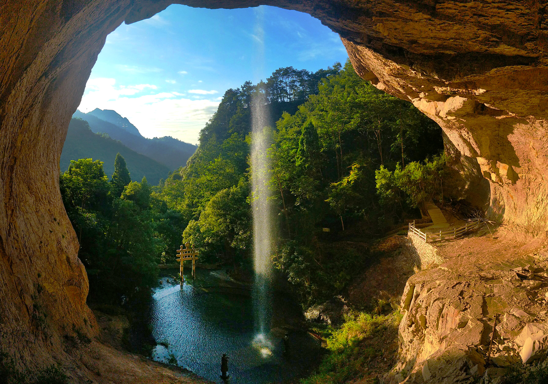 以红色的洞为前景,远方的山云层次丰富,逆光拍,框式构图。