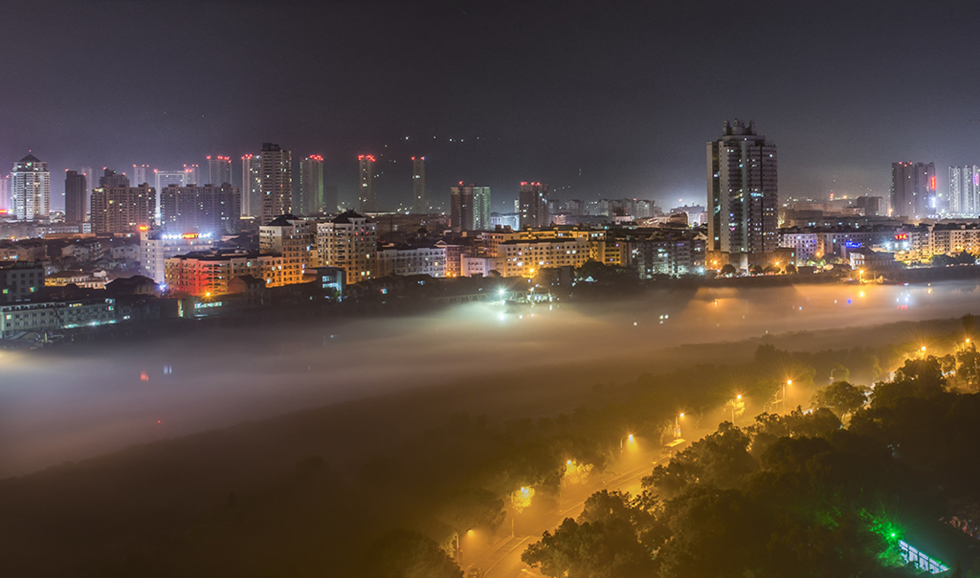 2017.6.22夜拍摄于平阳鳌江湾。是夜,一觉醒来,见窗外一层浓雾沉积于江面上,犹如给古老的鳌江铺上一层轻柔的绒毛被,暖暖的……