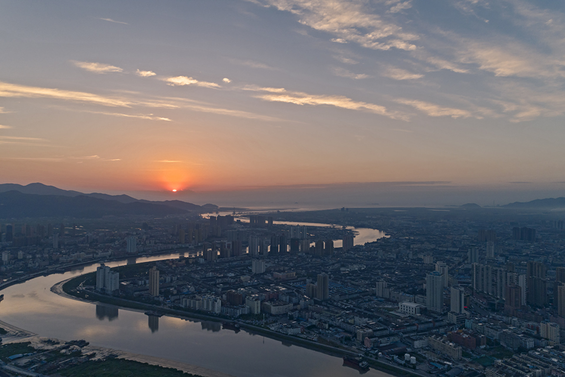 鳌江入海口仿佛是一条巨龙,穿越在鳌江与龙港两个城市之间,旭日初升,给这两个城市增添了无限活力
