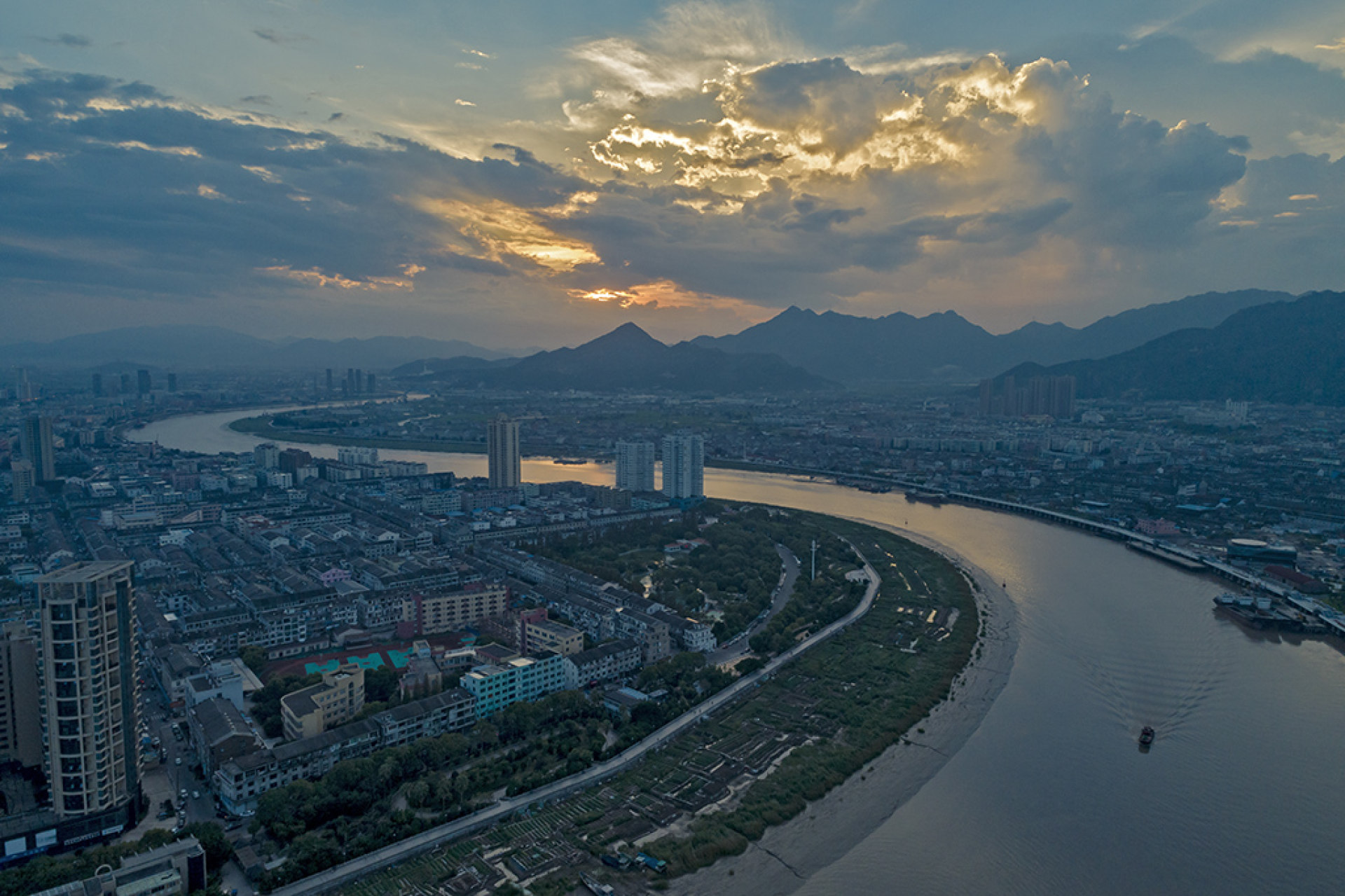作品用航拍无人机拍摄鳌江两岸,城市江景,夕阳落日