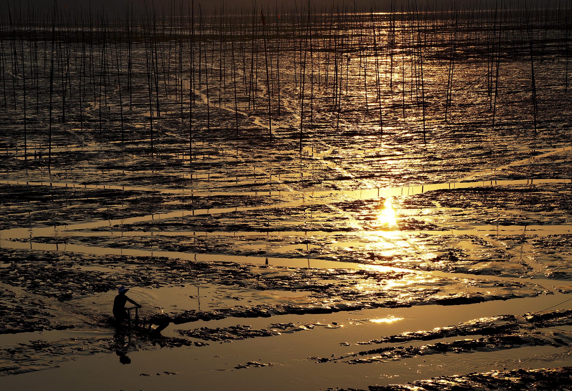 落日西沉,渔民结束作业回岸。
