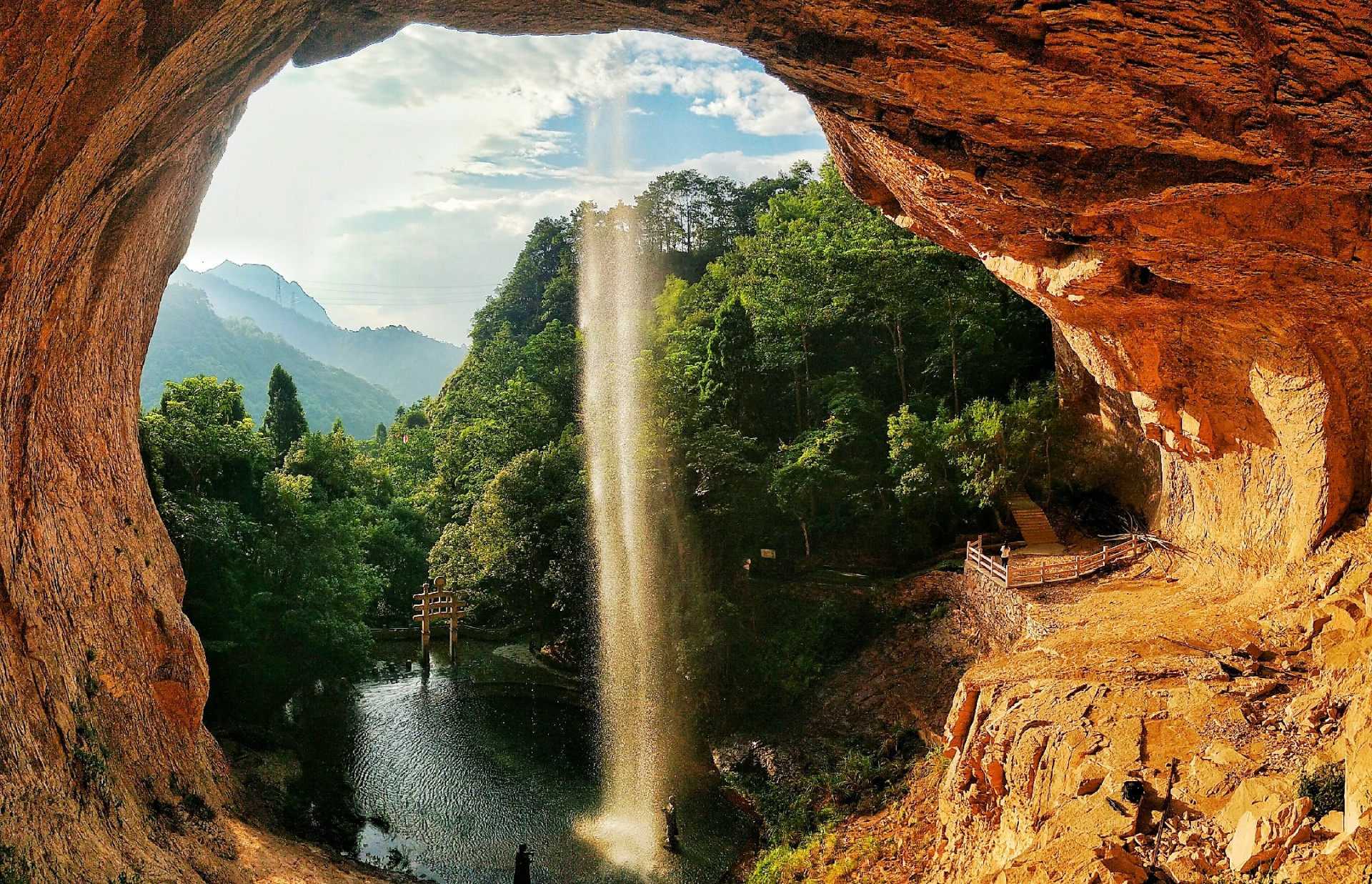 摄于雁荡山,瀑布挂在通红的洞前,一池碧水,蓝天,绿树,美。