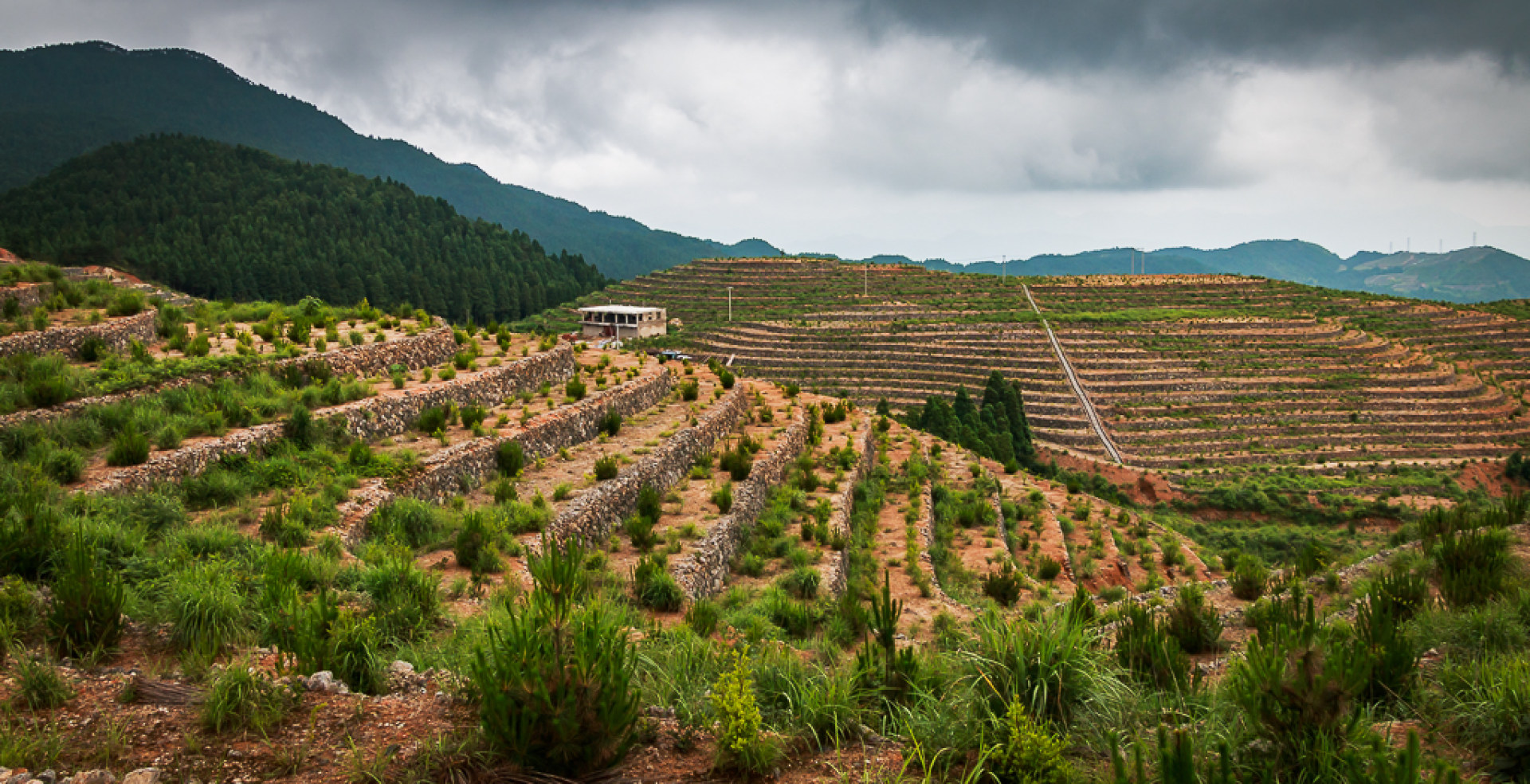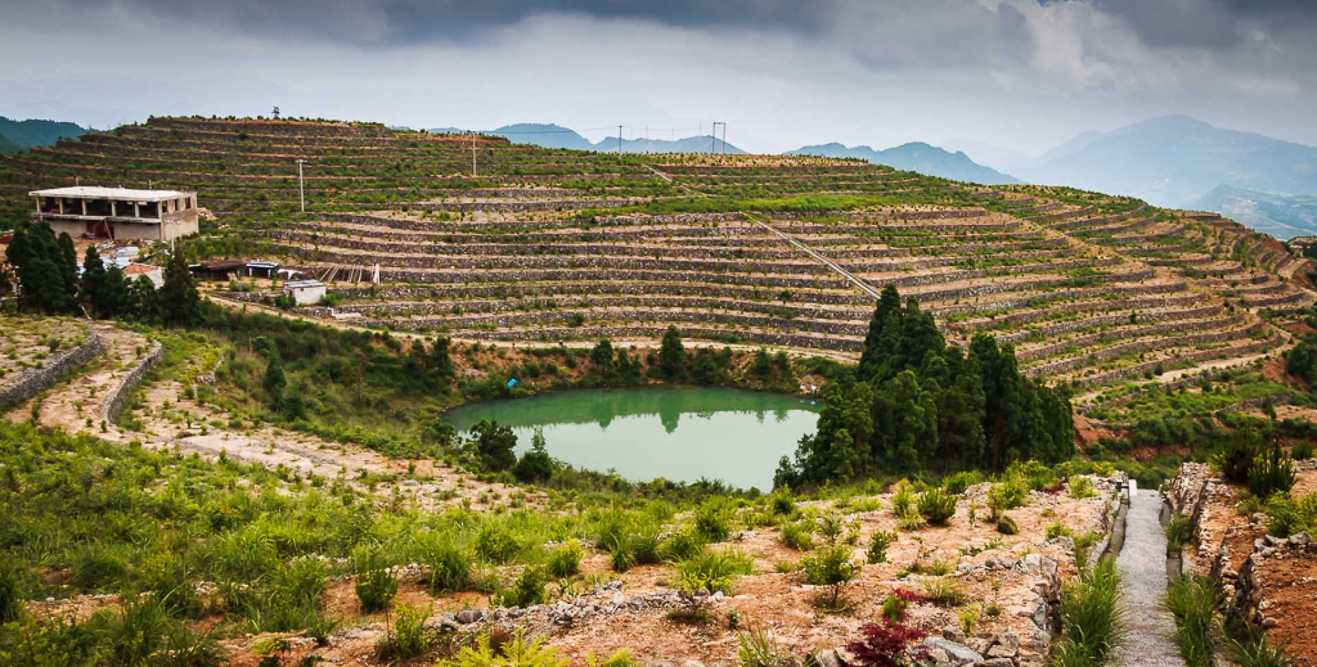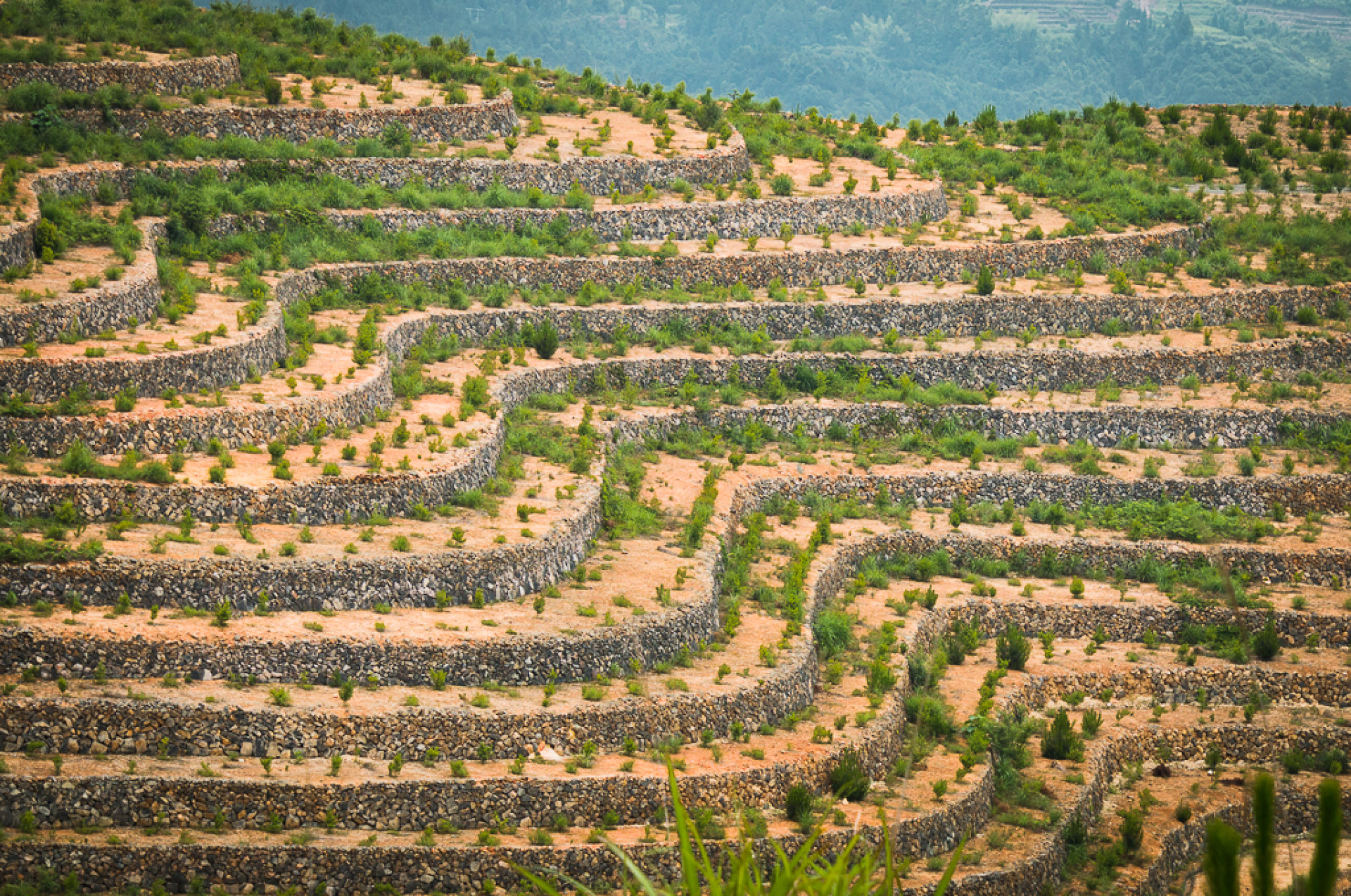 一有志青年回乡创业,耗时8年时间,将家乡高山上的3座荒山打造成千亩梯田,并种上油茶,红豆杉等经济作物,目前已初具规模,期待来年的绿树成荫.......