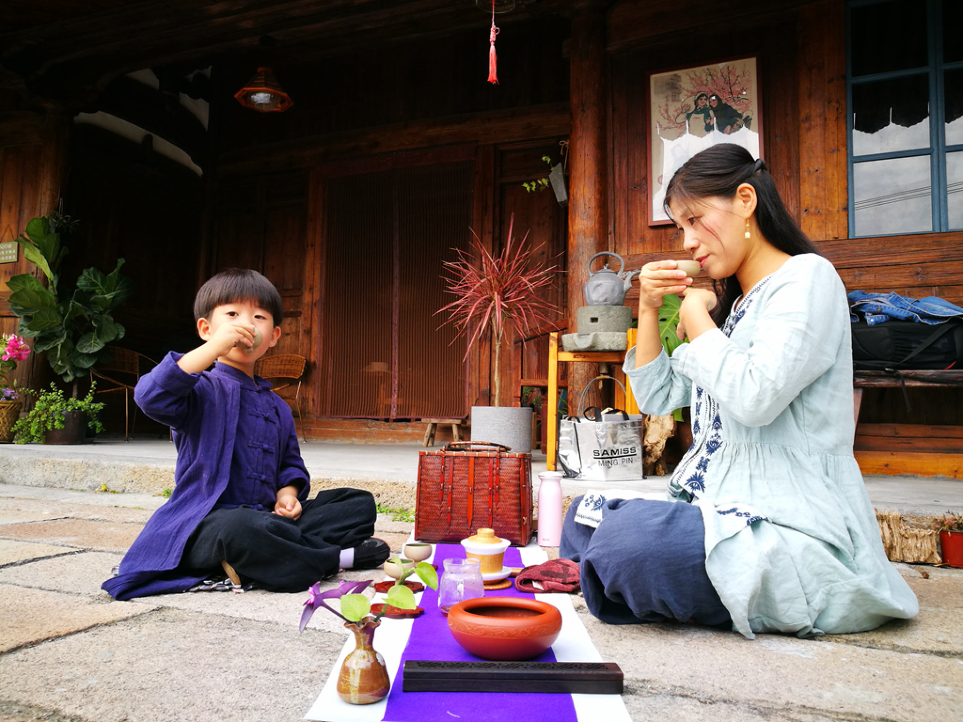 一对母子在品茗,母亲在教孩子茶艺之道。