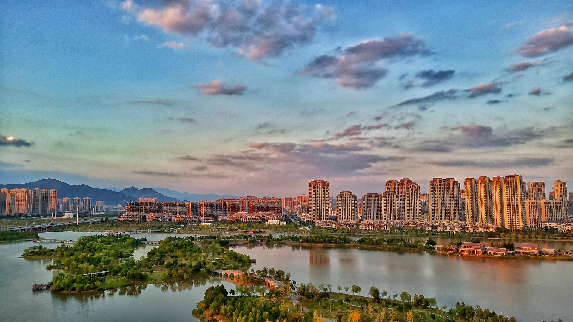 摄于乐清,新建了的清和公园夕阳下满湖金光。