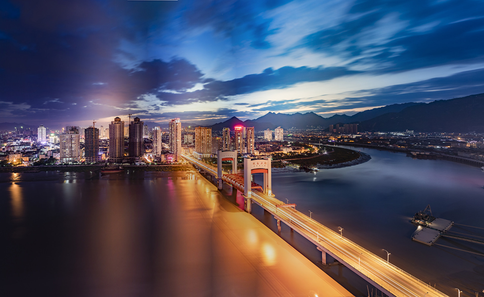 《欧南夜色》描述龙港连接鳌江的主干道桥梁欧南大桥的夜景。