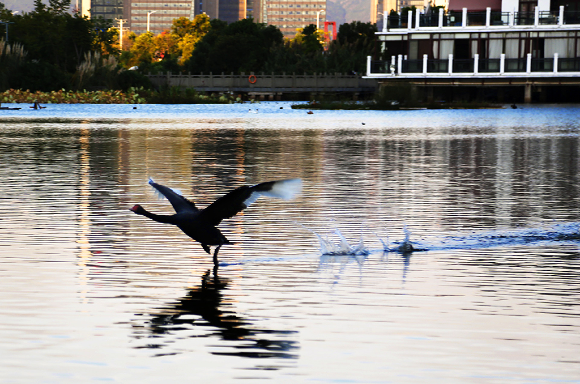 2018年 10月5日,一只调皮的天鹅在杨府山公园的水面上翩翩飞翔。