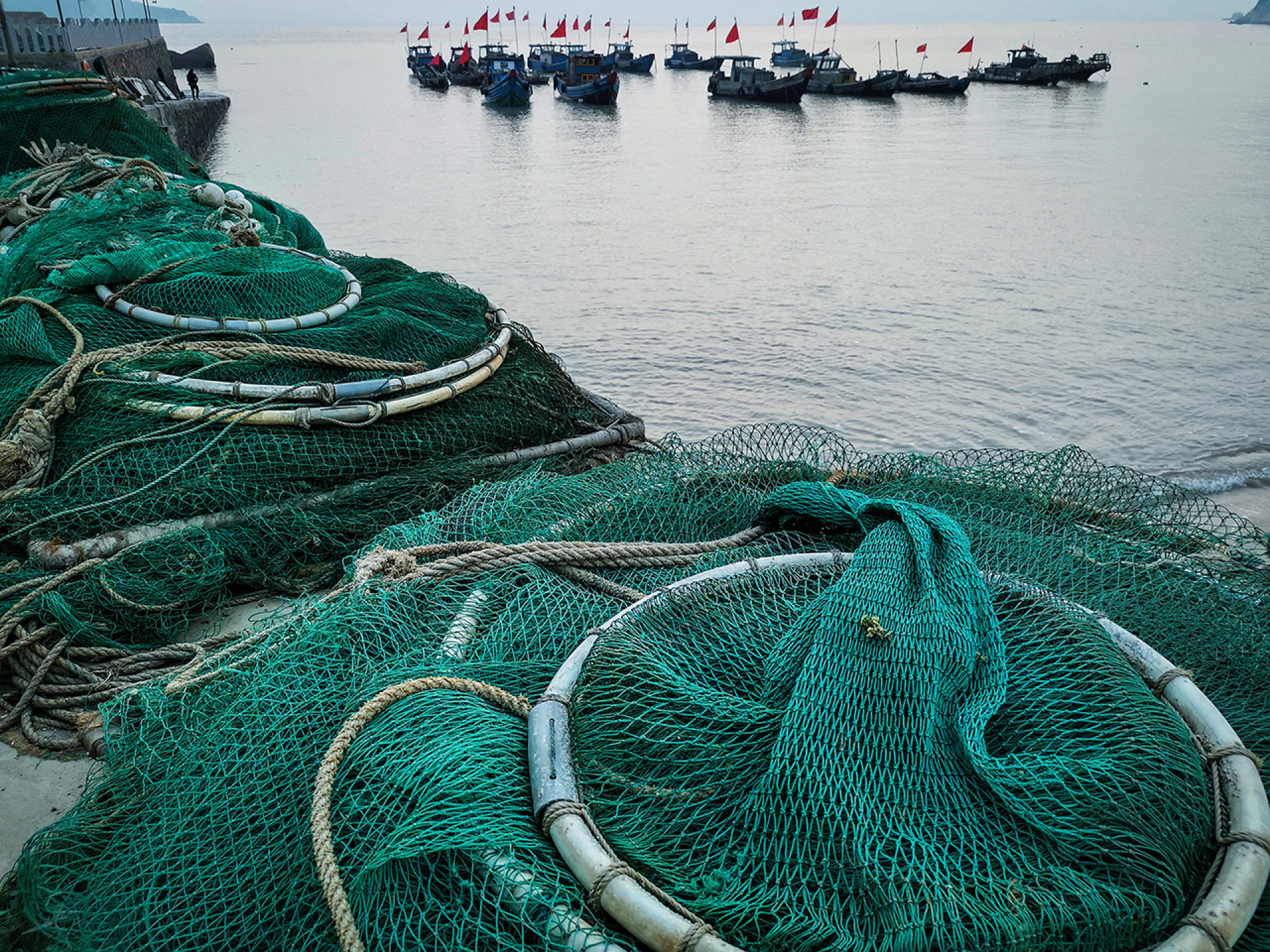 春节休渔期间,船进港,网上岸,人休息。