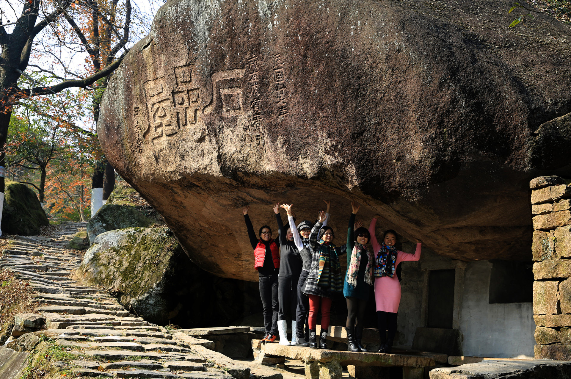 瞿溪石岩屋景点,游客想用手举起巨石
