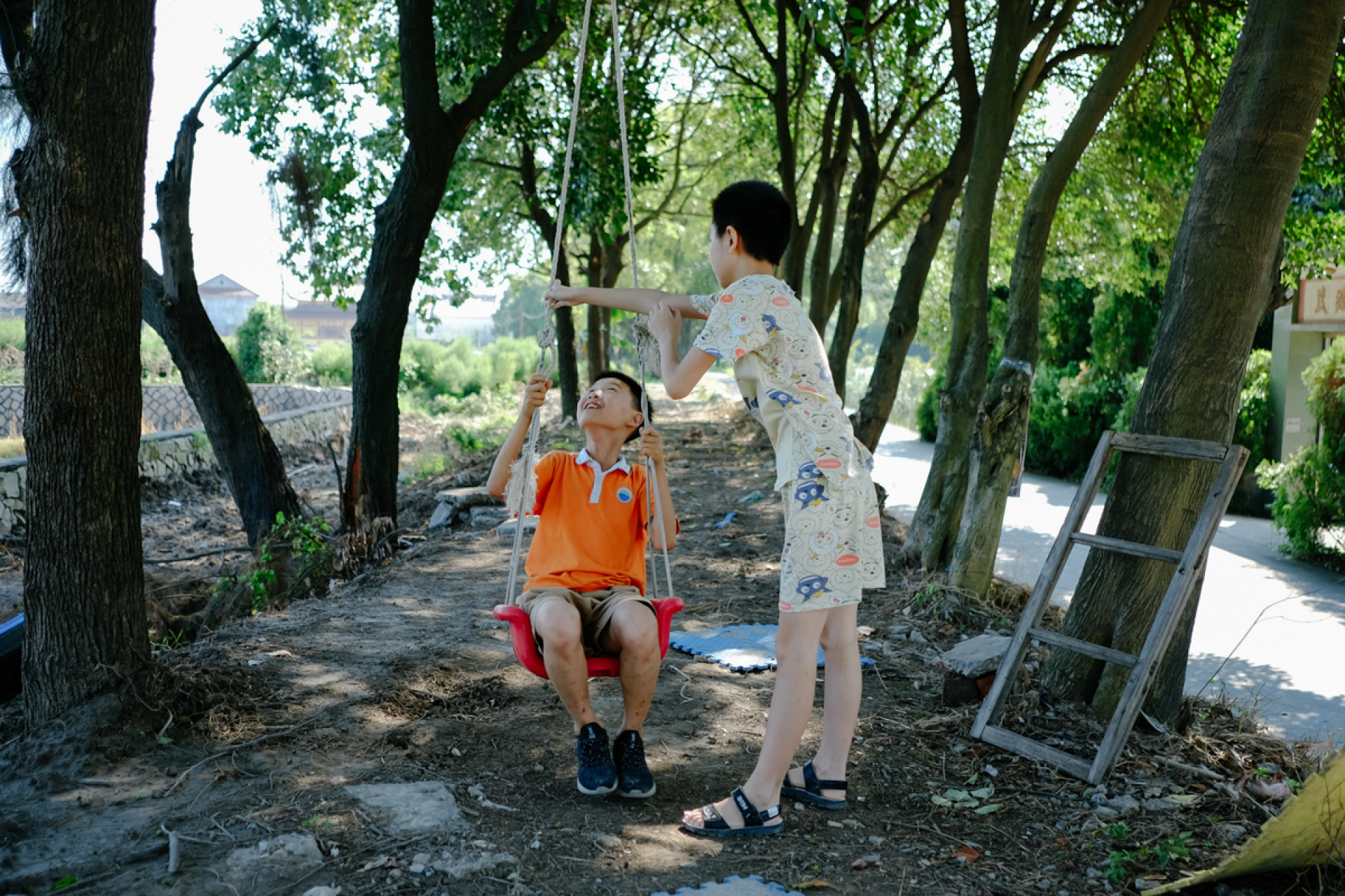 灵昆九村,两小孩玩着简易的秋千