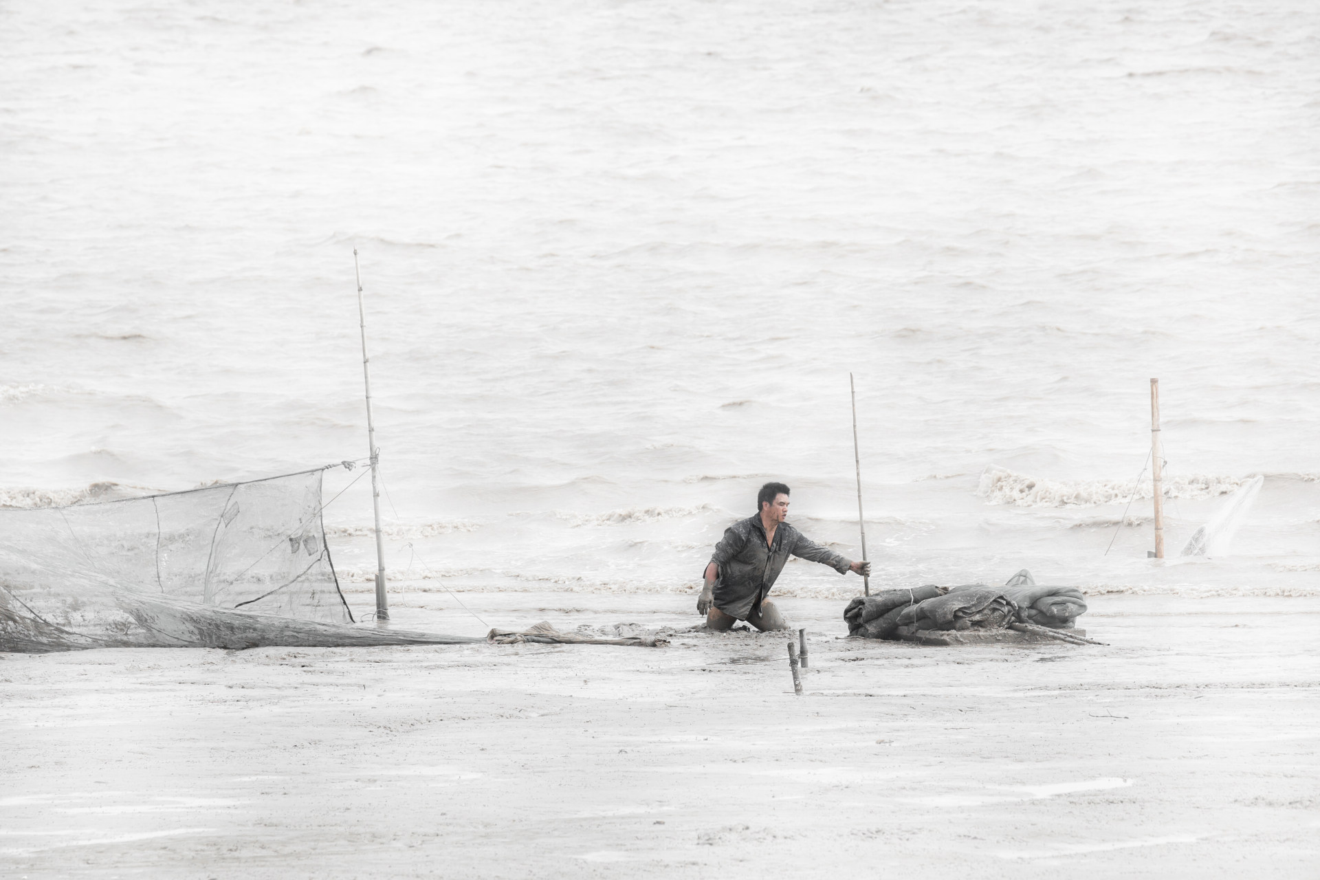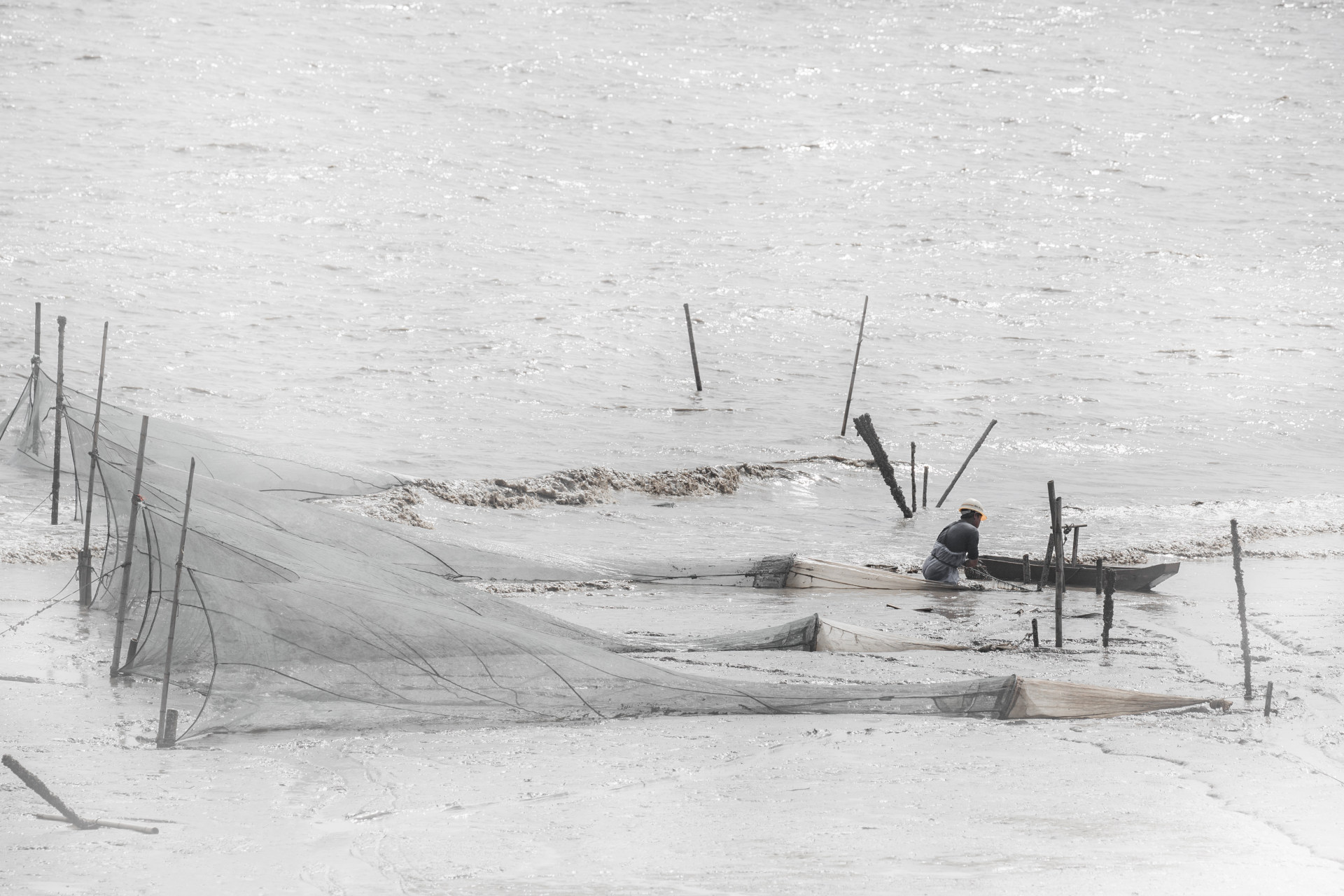 描述:瓯江口滩涂上在围网的人
