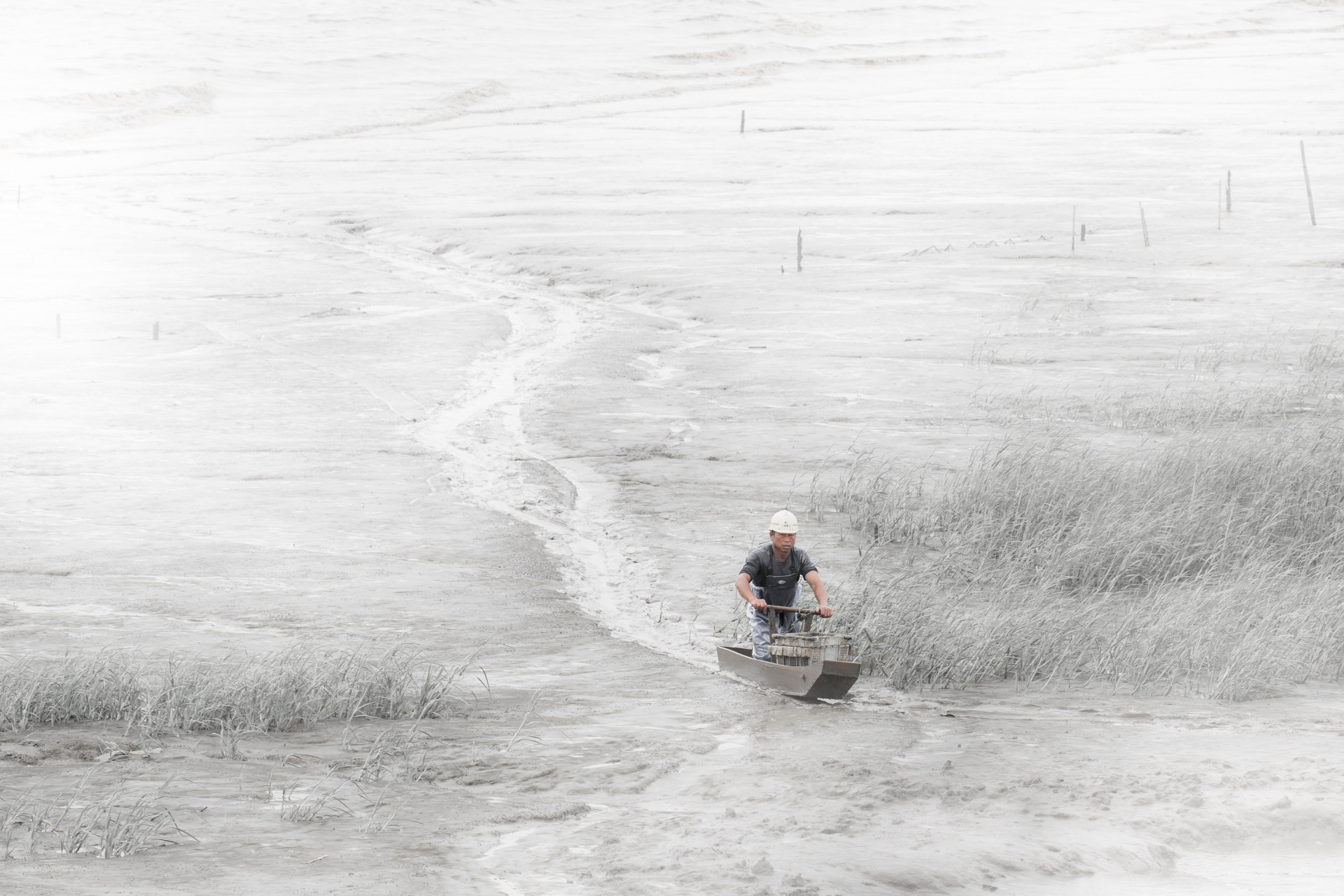 描述:瓯江口滩涂上划泥船劳作