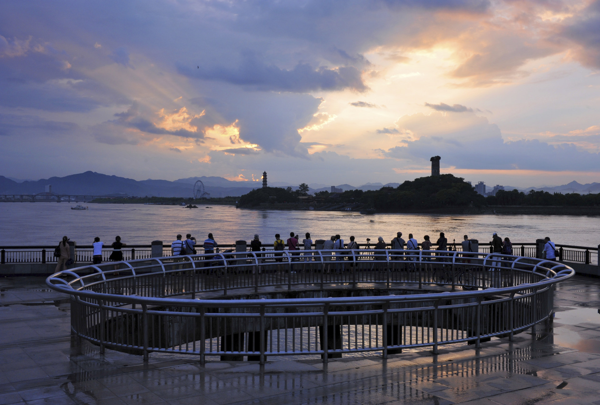 《江心晚霞》摄影作品源于温州望江东路的小广场,晚霞降临了,被云遮住了一些,泛出霞光,温州人来这个小广场目睹夜幕下的江心屿的美景。