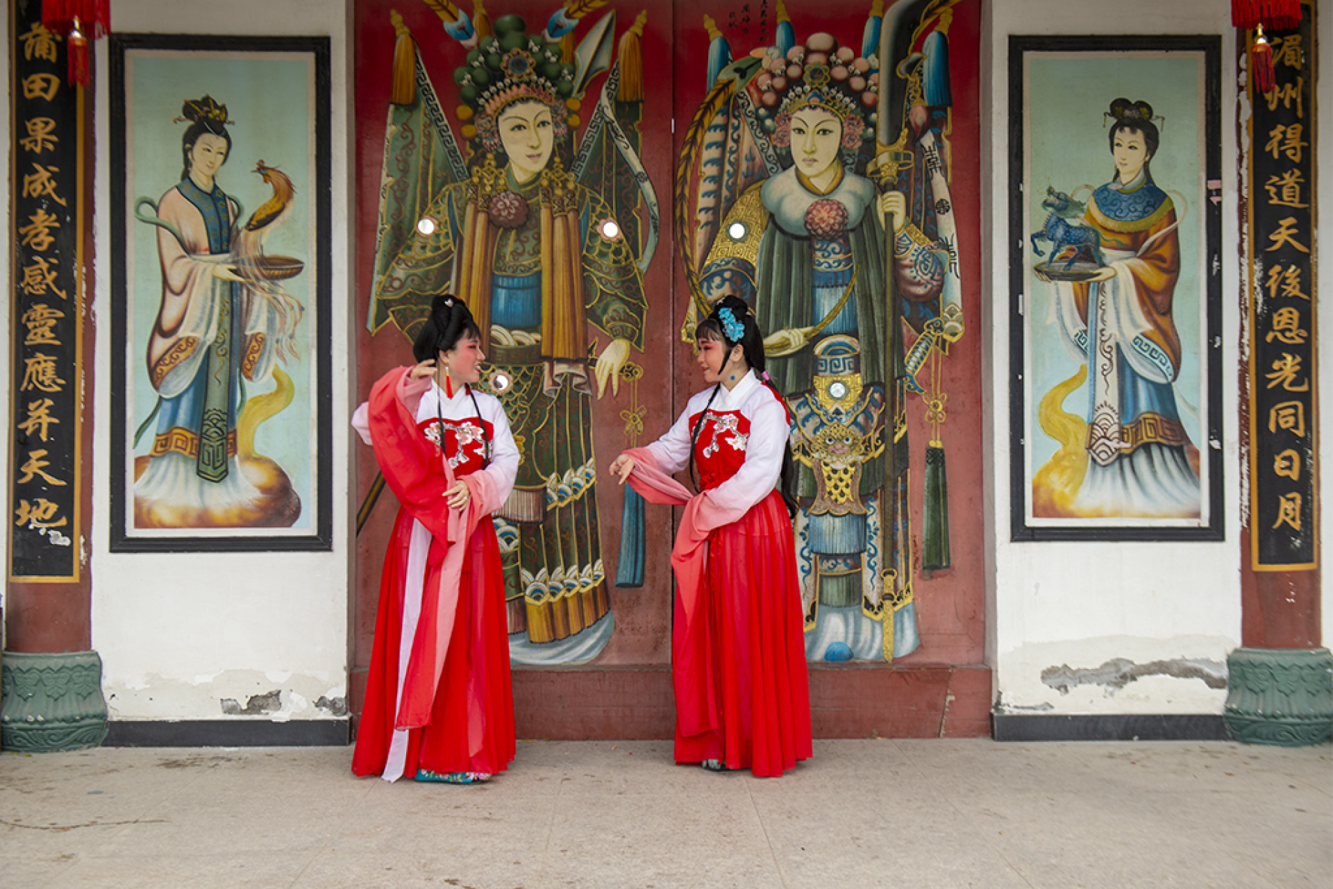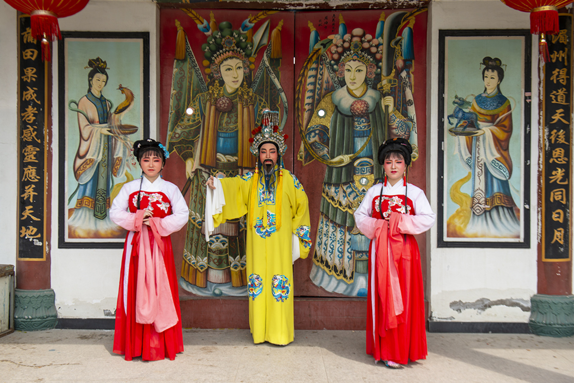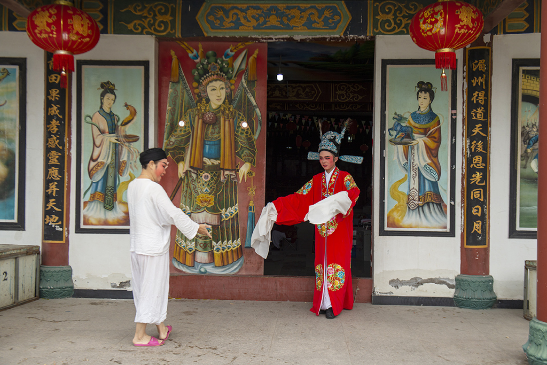 今年6月16日上午,在瓯江口新区灵昆街道九村天妃宫,戏曲演员正在加紧彩排。